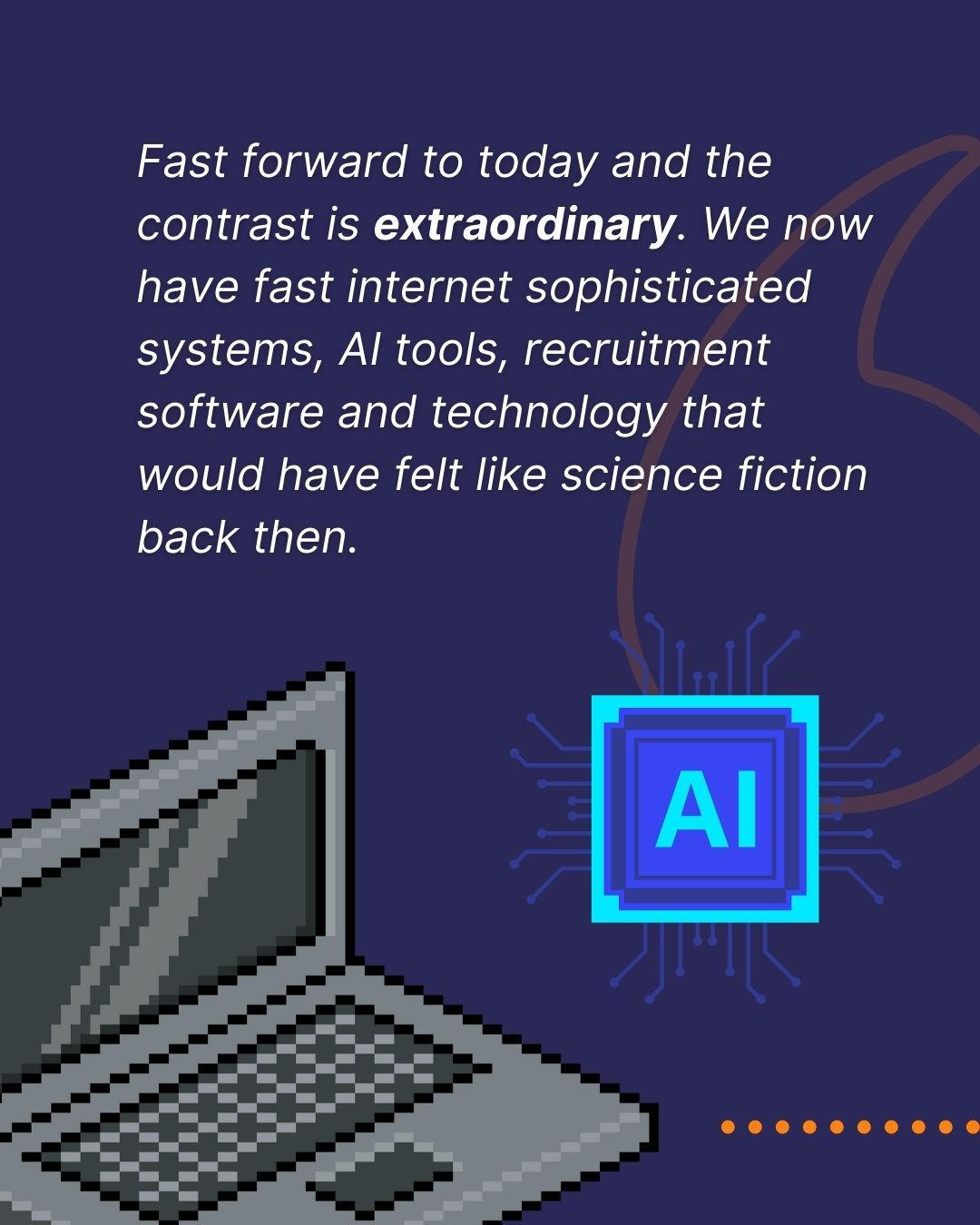 Fast forward to today and the contrast is extraordinary. We now have fast internet sophisticated systems, AI tools, recruitment software and technology that would have felt like science fiction back then.