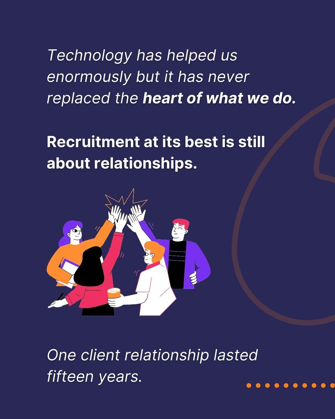 Technology has helped us enormously but it has never replaced the heart of what we do. Recruitment at its best is still about relationships. Long term relationships with candidates. Long term relationships with clients. One client relationship lasted fifteen years. That does not happen by accident. It happens when you listen properly stay curious and do the work with integrity and build trust and deepen the relationship constantly. They also became part of us and we part of them in many ways.